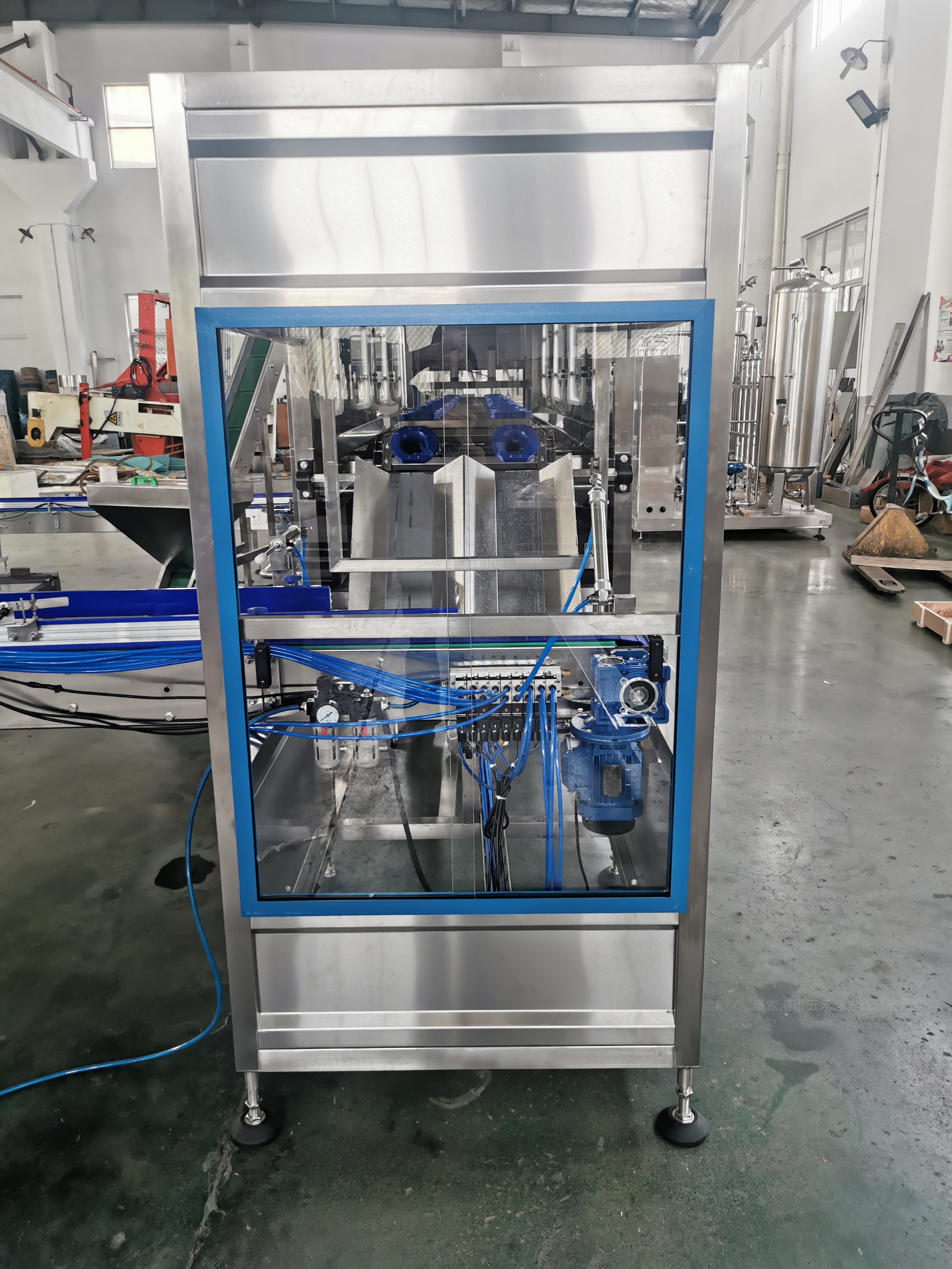 该机结构紧凑、占地厂房小、工作效率高且稳定可靠、自动化程度高。操作工仅需二人,是机电气三位一体的全自动桶装设备。